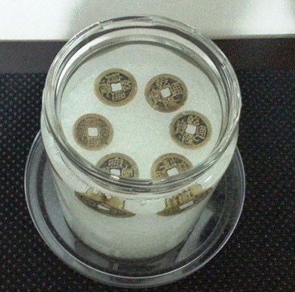 Khoảng chiều ngày cuối năm, bạn nên thay một lọ nước muối mới cho gia đình sau khi cả nhà và mọi thành viên trong gia đình đã sạch sẽ. Cho muối vào đầy 3/4 bát hoặc ly thủy tinh rồi đặt 6 đồng xu (mặt dương ngửa lên) theo hình vòng tròn vào bát. Cho nước từ từ vào và đặt bát lên một miếng vải lót. Trong suốt một năm, không che miệng bát và để yên tại cùng một vị trí, không xê dịch hay động chạm.