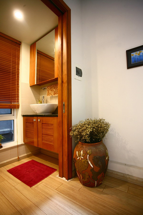 Bồn rửa tay được tách biệt với WC để sảnh tầng có thêm không gian và tận dụng ánh sáng, thông gió qua ô cửa sổ sau nhà.
