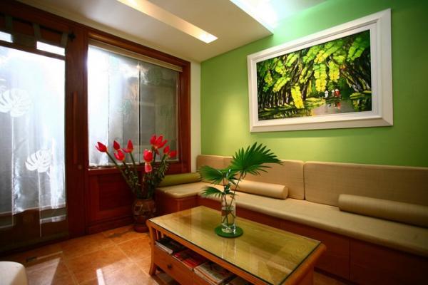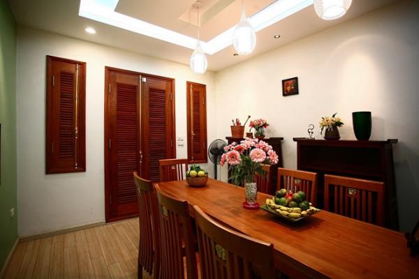 Màu sắc chủ đạo là màu sáng kết hợp với tông nâu trầm của đồ gỗ nội thất mang lại cảm giác ấm áp. Điểm xuyết là những mảng xanh cốm - sắc màu ưa thích của chủ nhà.