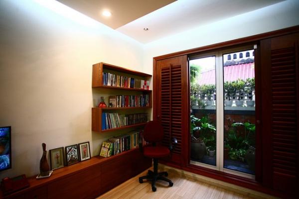 Phòng ngủ kiêm thư phòng nhìn ra khoảng xanh ở ban công. Không gian được thiết kế tận dụng tối đa diện tích với những giải pháp hiệu quả như cửa lùa, vách nhẹ.