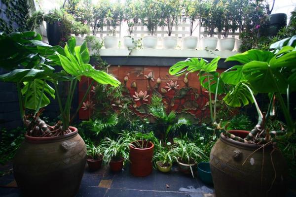 Cây được bố trí ngoài ban công có diện tích khiêm tốn nhưng vẫn tạo mảng xanh mát mắt. Tường được ốp gạch gốm mộc mạc phù hợp với phong cách sân vườn.