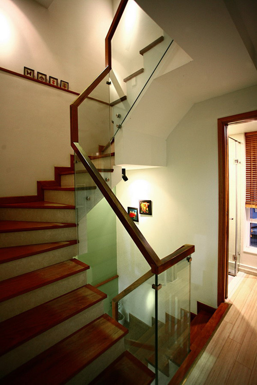 Cầu thang sử dụng vật liệu gỗ - kính đem lại cảm giác hiện đại, khỏe khoắn. Dọc lối lưu thông trang trí những bức ảnh ưa thích của chủ nhân.