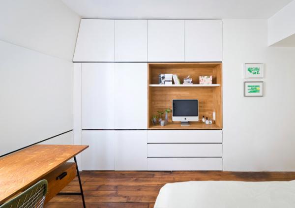 Bức tường cũng là nơi để đồ, cầu thang lên xuống, bàn làm việc xếp gọn.