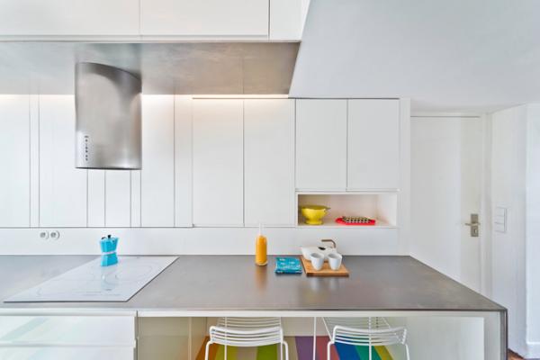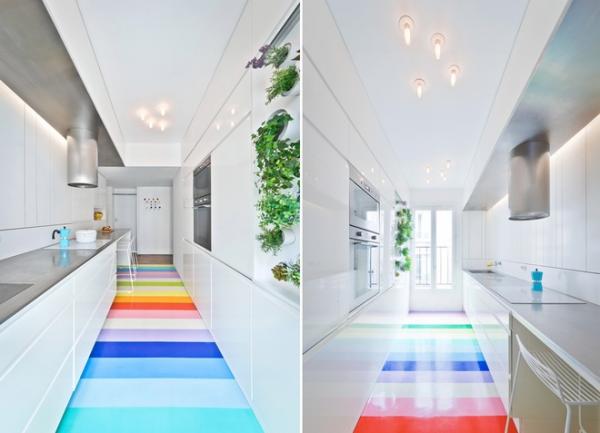 Điểm nhấn ấn tượng nhất trong nhà là bếp với sàn nhà đủ sắc màu. Khu vực nấu nướng được bố trí ở hai phía song song nhau.