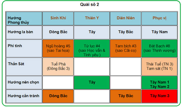 Năm nay, người có quái số 2 có các lựa chọn tối ưu là hướng Tây (Thiên y), Tây Nam 1 và 2 (Phục vị). Cần cân nhắc khi chọn hướng Tây Bắc (Diên niên) và tránh kê bàn hay kê đầu giường về các hướng hướng Tây Nam 3 (Phục vị) và Đông Bắc (Sinh khí).