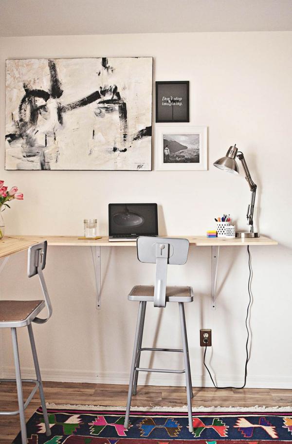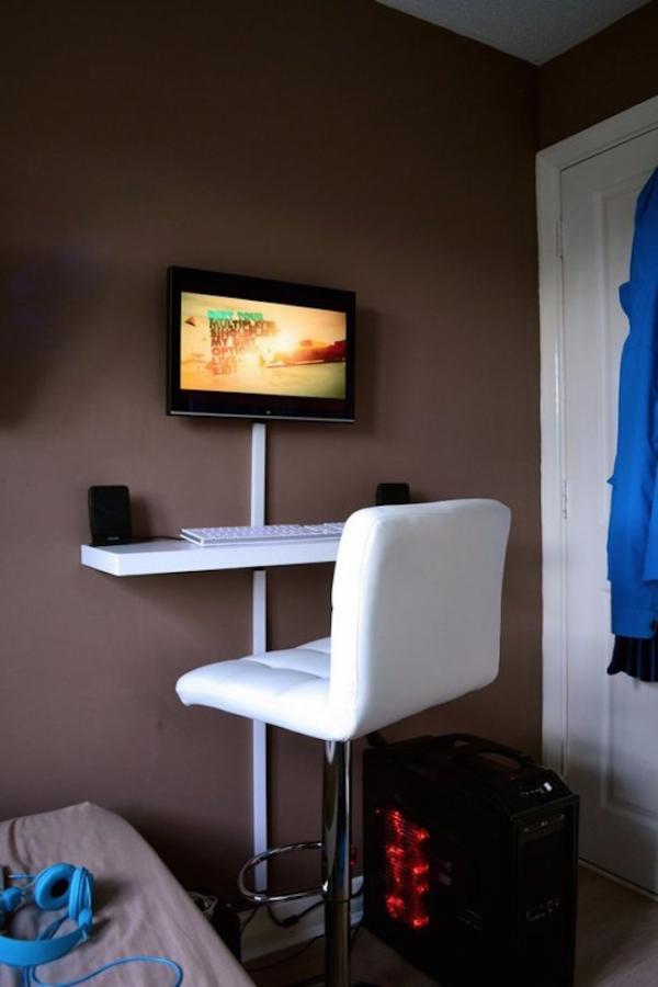 Bạn vẫn không dư không gian để lắp đặt một chiếc bàn sát tường? Vậy hãy tạo một chiếc kệ nhỏ siêu gọn và cực ngắn chỉ đủ để bàn phím, còn màn hình máy tính thì treo thẳng lên tường.