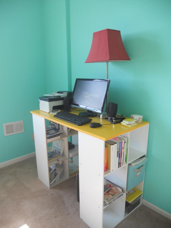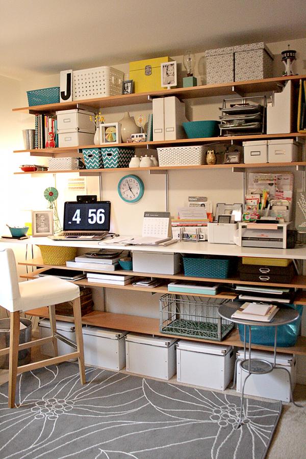Không phải ai cũng đủ diện tích và ngân sách để làm một chiếc bàn làm việc có giá sách mới hoàn toàn cho căn hộ như gợi ý trên. Hãy tận dụng những tủ đồ hay kệ ti vi thấp có sẵn của nhà nếu tìm vị trí làm bàn đứng ở độ cao phù hợp.