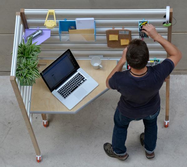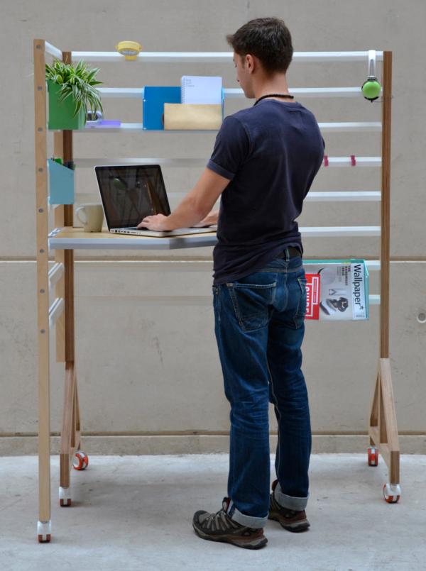 Trong thiết kế thông minh này, chiếc bàn đứng của bạn là một phần của một chiếc giàn gỗ có các thanh ngang giống bậc thang. Bạn có thể dịch chuyển chiếc bàn đứng đặc biệt này đến bất cứ góc phòng nào bạn muốn và sử dụng những thanh ngang để treo sách, tai nghe và các vật dụng văn phòng khác.