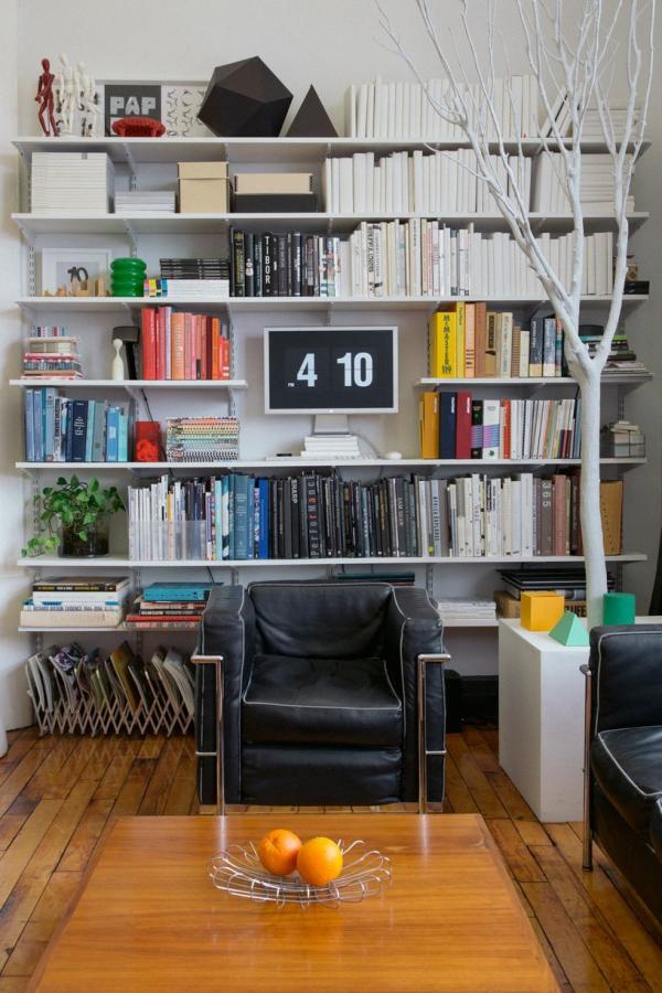 Thay vì làm một chiếc tủ sách kín, bạn có thể nghĩ đến một ý tưởng đơn giản hơn với các thanh kim loại khoan vào tường làm giá đỡ cho các tấm gỗ, làm thành giá sách tầng. Trong đó, bàn đứng của bạn là một phần của giá sách đó. Tất nhiên, bạn vẫn có thể bổ sung thêm một chiếc ghế ngồi khi mỏi chân.