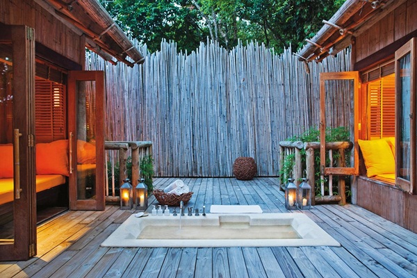 Những chiếc đèn vàng lung linh vừa tạo cảm giác ấm áp vừa tạo vẻ sang trọng cho phòng tắm ngoài trời của bạn.