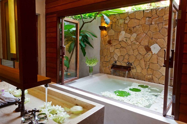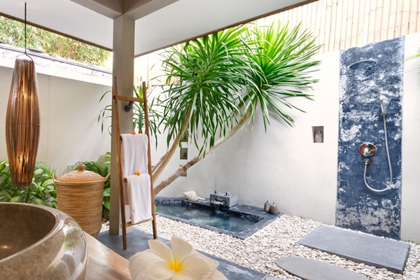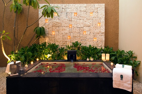 Nếu bồn tắm được đặt cách xa nhà, bạn nên làm một mái che bằng lá để tạo sự dân dã, tự nhiên cho không gian.
