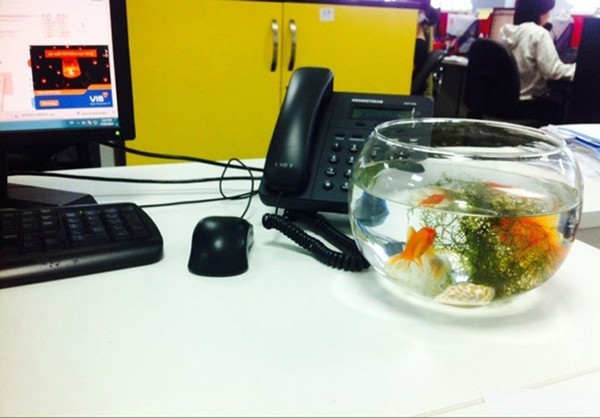 Bên cạnh chậu cây xanh thì một bể cá mini cũng góp phần mang đến sự sinh động, đồng thời đem lại may mắn khi đặt trên bàn làm việc. Còn gì thích thú hơn khi ngắm nhìn những chú cá nhỏ đang tung tăng bơi lội trong làn nước xanh mát? Nuôi cá cảnh là thú vui tao nhã giúp cân bằng tinh thần, mang bạn đến gần thiên nhiên hơn, tạo nguồn cảm hứng trong công việc.