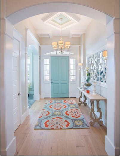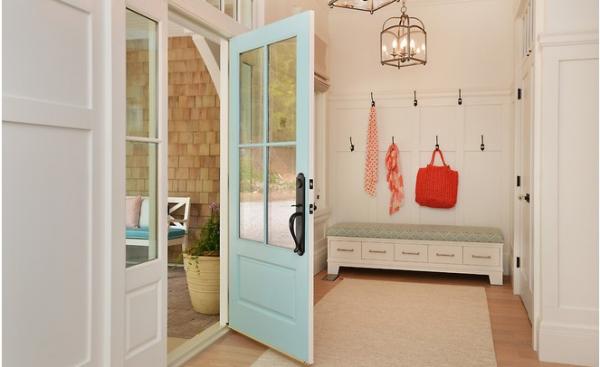 Với ngôi nhà dưới đây, chủ nhà đã chọn màu xanh dương để tô kín cho mặt trong cánh cửa, cực ăn nhập với màu thảm trải trên sàn cùng tường trắng bao quanh. Cánh cửa xanh đã thêm phần hài hòa, sinh động và sự quyến rũ cho lối ra vào có thiết kế rất đơn giản này.