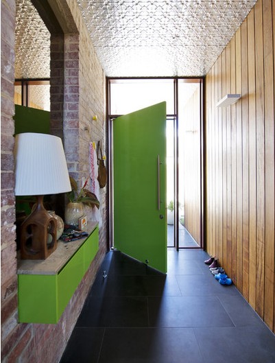 Với những ai thích sự độc đáo, màu xanh chuối có thể là lựa chọn lý tưởng dành cho bạn. Cánh cửa xanh ngắt chói lóa trong ngôi nhà dưới đây đã mang đến hương sắc mới cho những bức tường gạch trơn tông màu ấm áp.