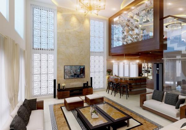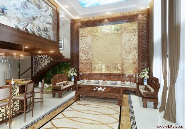 Phòng khách thiết kế theo phong cách truyền thống với mảng trang trí bằng đồng và gỗ ấn tượng, bề thế. Bộ sofa và vật dụng trang trí bằng chất liệu gỗ tự nhiên. Khu vực quầy bar và tiểu cảnh cũng là một mảng nhấn khác cho không gian.