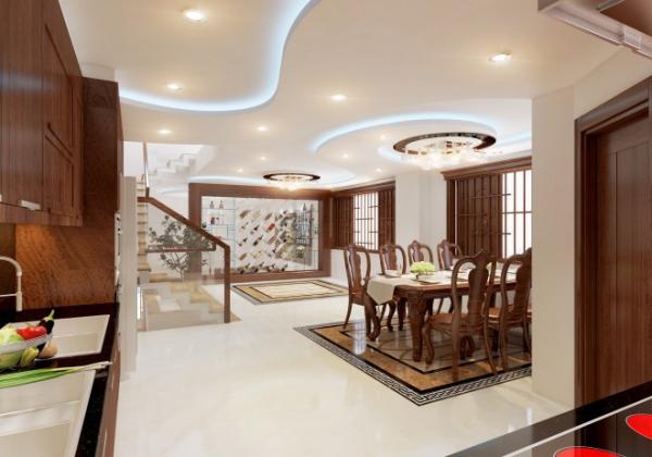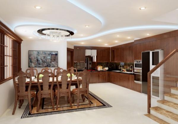 Toàn bộ hệ thống kệ bếp và bàn ăn xuyên suốt bằng chất liệu gỗ màu sậm theo phong cách bán cổ điển sang trọng. Trần thạch cao với các chi tiết uốn lượn tạo cảm giác mềm mại, thanh tao cho toàn bộ không gian.