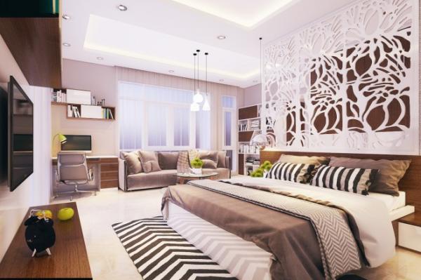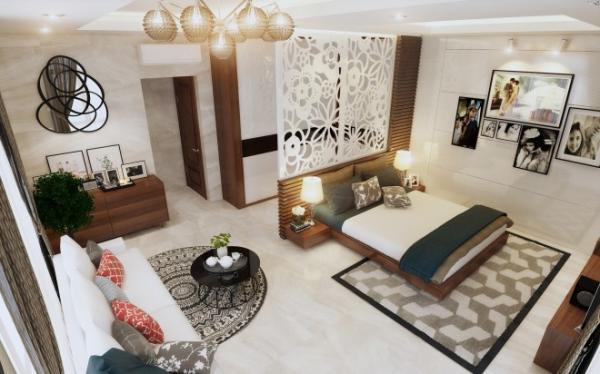 Phòng ngủ master với vách trang trí CNC làm điểm nhấn tao nhã ngăn cách không gian giường ngủ và khu vực thay đồ. Ánh sáng bố trí theo từng khu vực mang đến vẻ tinh tế.