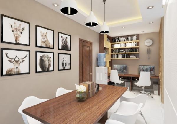 Phòng học và làm việc bố trí đơn giản, điểm chút màu vàng nhạt trên tông nâu.