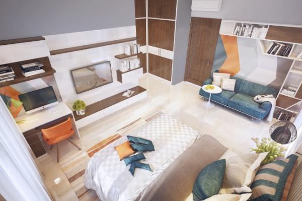 Phòng ngủ con trai út theo phong cách hiện đại pha lẫn tông màu cổ điển, mang đến vẻ tinh tế và sang trọng. Toàn bộ vật dụng bố trí giản dị, chủ yếu sử dụng nhiều mảng nhấn có độ tương phản màu sắc tạo nétcá tính.