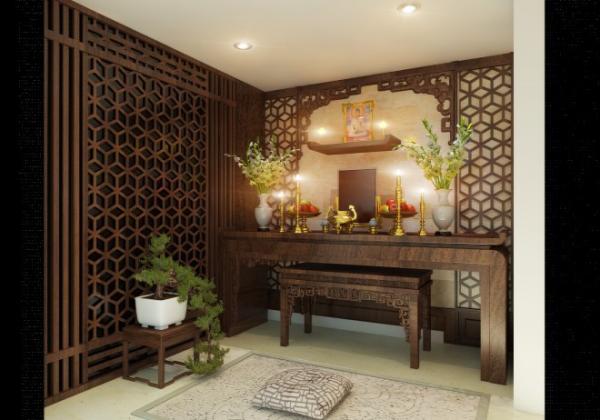 Phòng thờ với tông gỗ sậm hoa văn bán cổ điển vừa trang nghiêm vừa tinh tế.