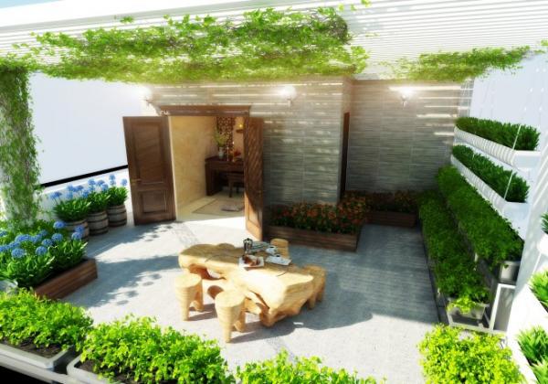 Khu vực sân thượng được bố trí như một khu vườn thu nhỏ với không gian thư giãn, trồng hoa và vườn rau mini phục vụ cả gia đình.