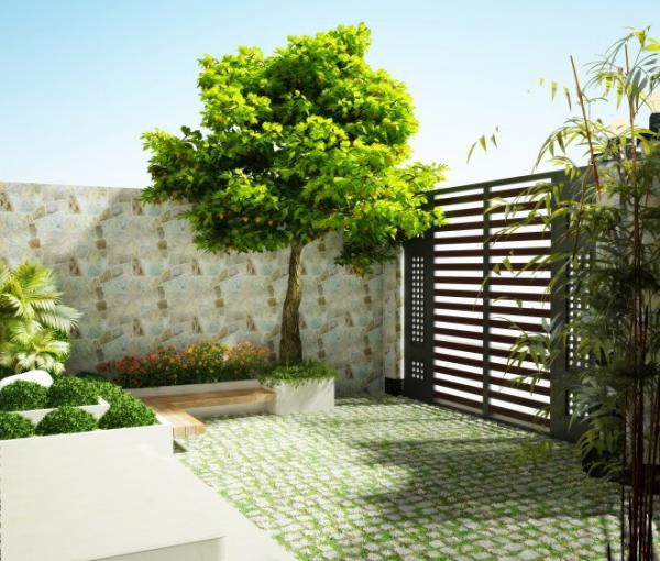 Khu vực sân trước có cây ăn trái và cây lơn để tạo bóng mát.